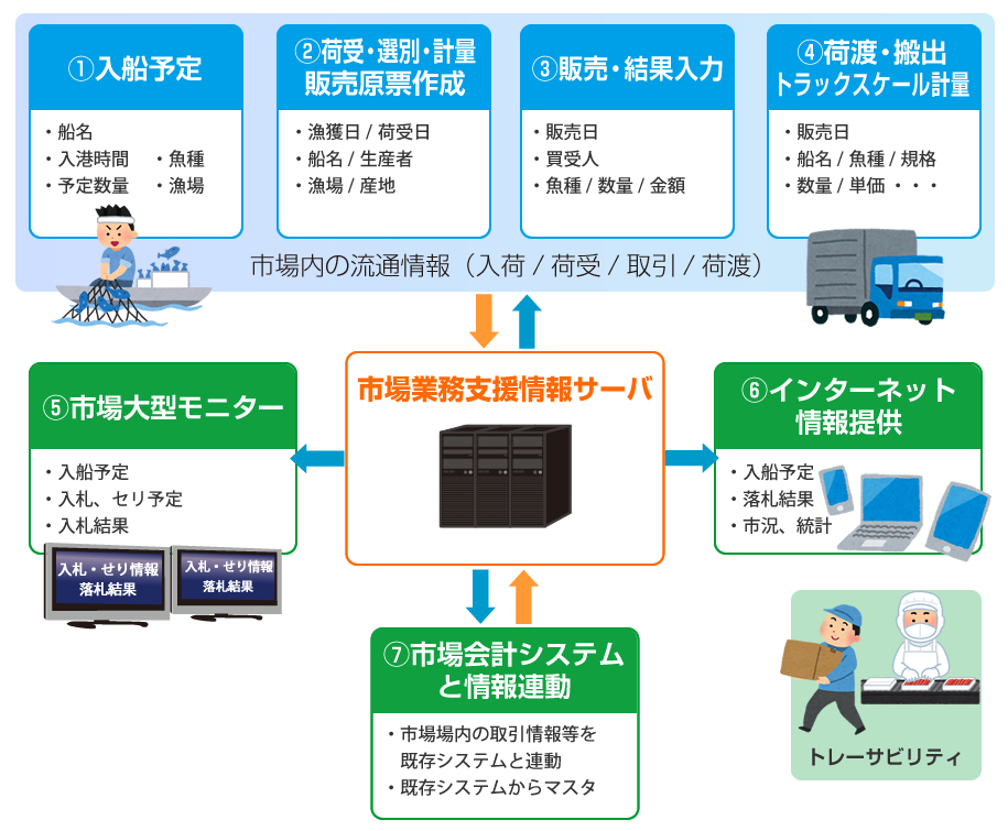 水揚・入札情報などが大型モニターに短時間で表示されます。